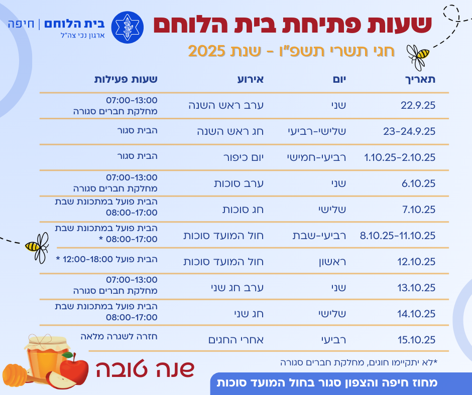 ראו שעות פתיחה של בית הלוחם חיפה בתקופת חגי תשרי תשפ"ו: